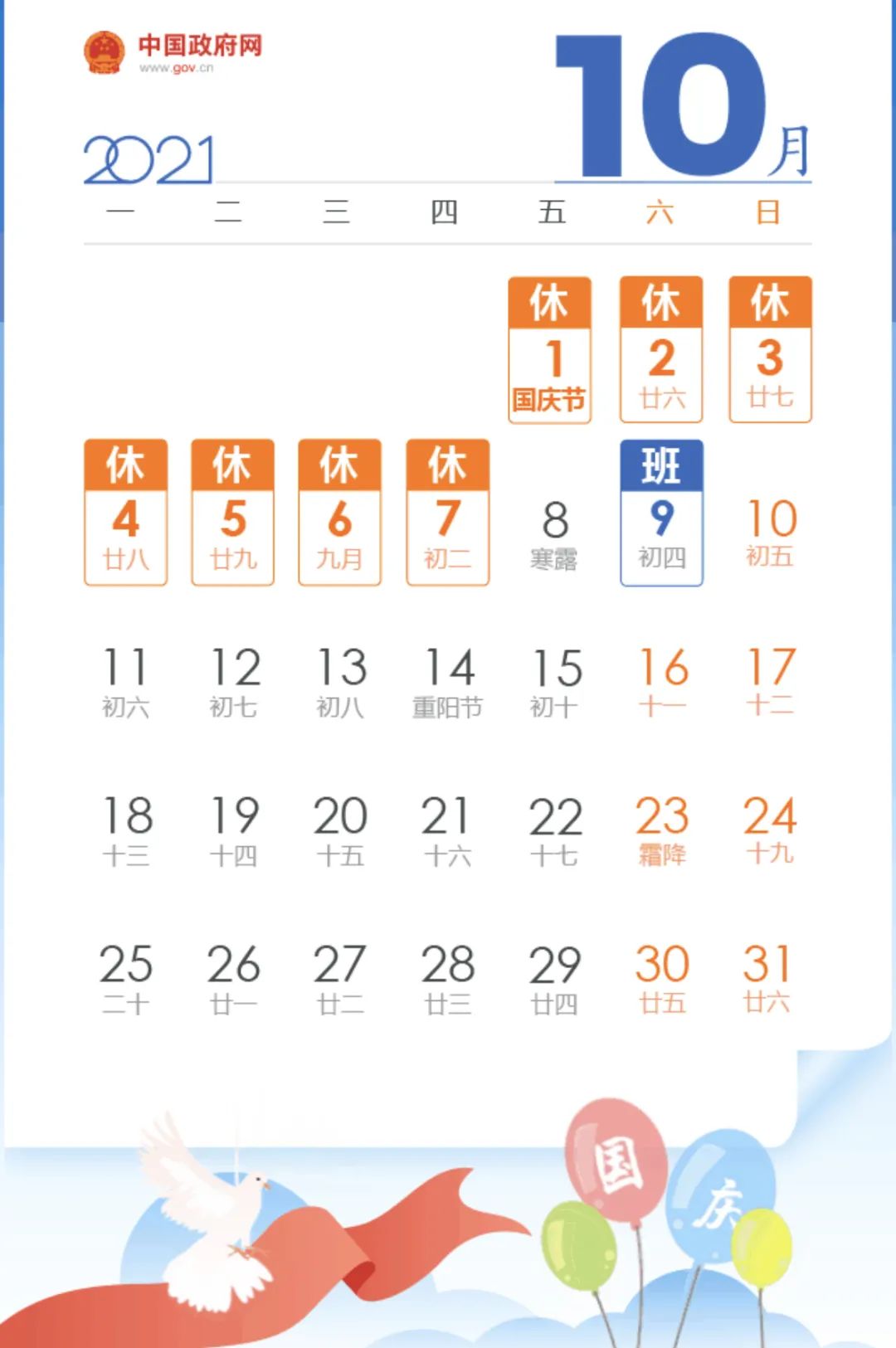 10月1日(周五)至10月7日(周四)放假調(diào)休,共7天。